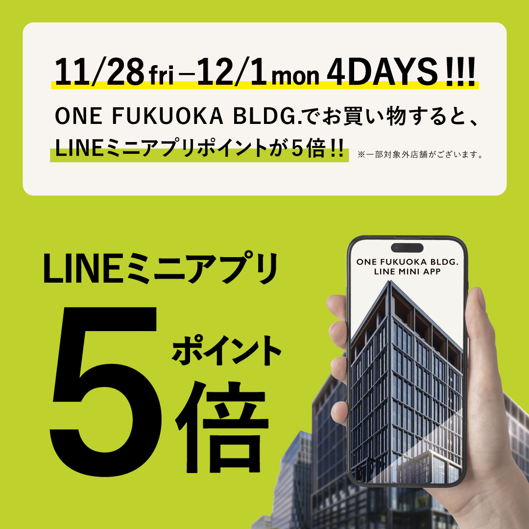 2025年11月28日(金)~12月1日(月)の4日間、ONE FUKUOKA BLDG.の店舗でお買い上げされた方は、LINEミニアプリポイントを5倍進呈いたします。