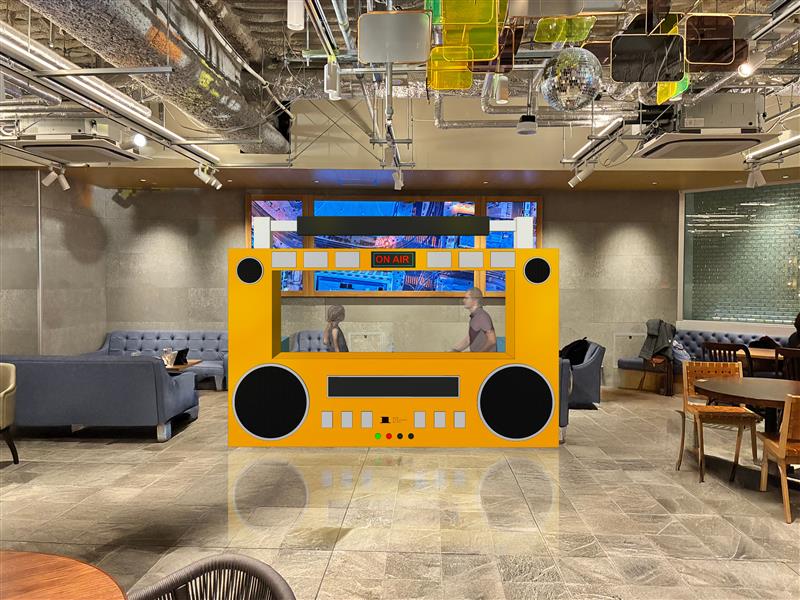 LOVE FMとコラボレーションし、フードホール奥に「巨大ラジカセ」型の特設ブースが登場!自分の好きな曲を紹介し、実際に館内でオンエアする「ラジオDJ体験」と、ワンビルの魅力を伝えるCM原稿を読み上げ収録する「ラジオCM制作体験」を実施。後日、LOVE FMのCMとして実際に放送されます。