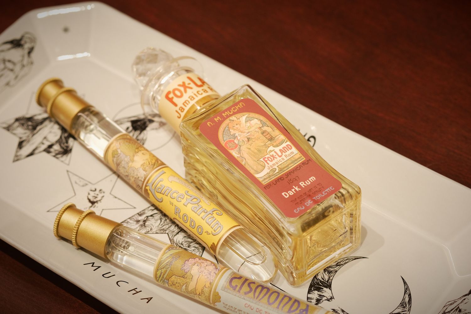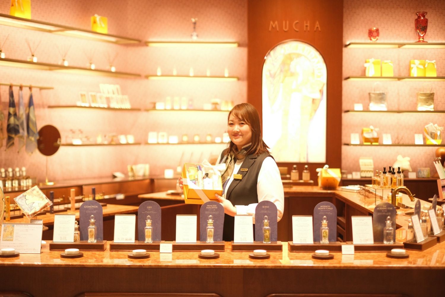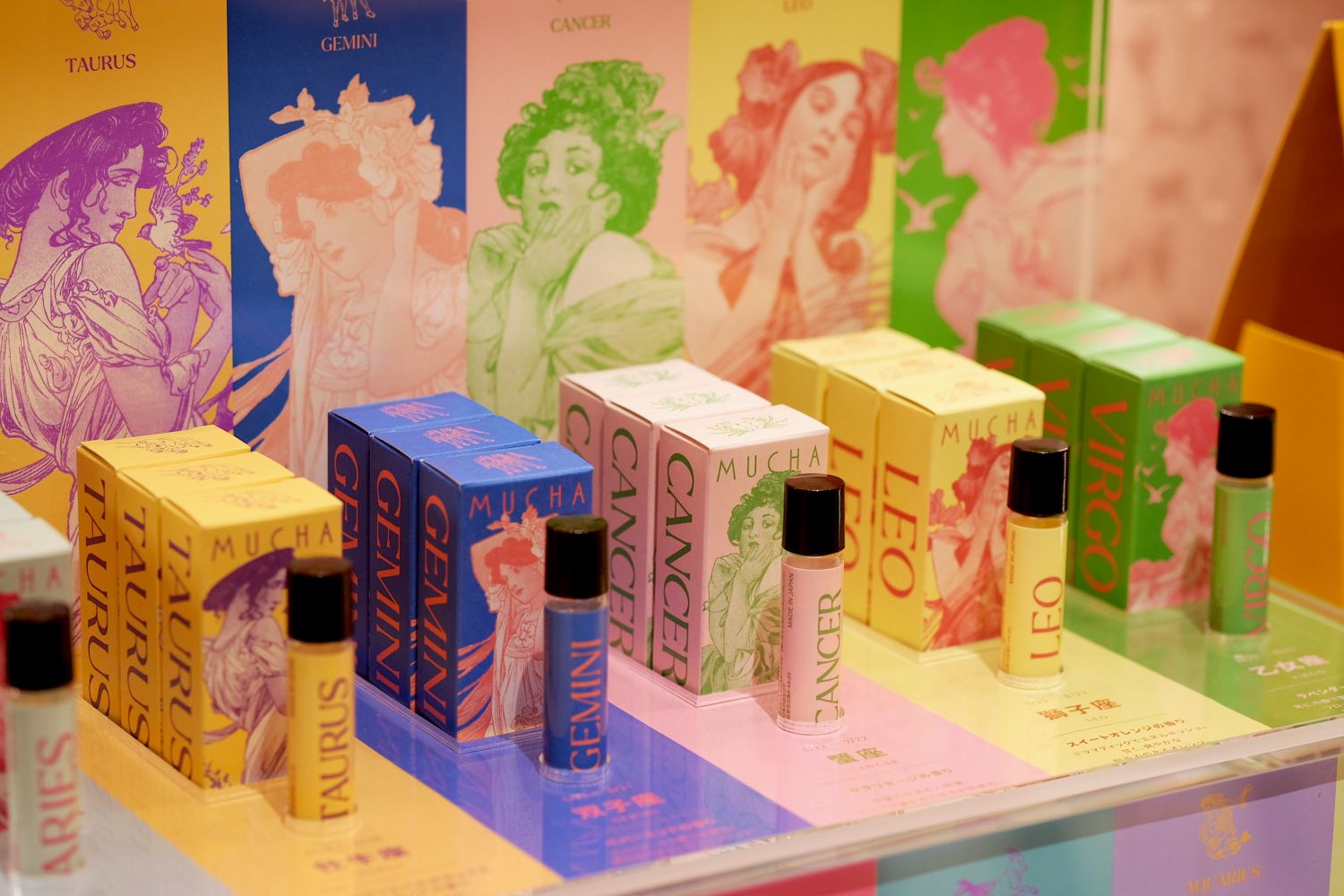 現在、店頭には11種類の香水をラインナップ。これらはフランスの香水の聖地・グラースで調香され、香りごとに異なる調香師が手がけているのだそう。ミュシャの絵画からおのおのインスピレーションを受けて一つずつ調香。その多様な解釈と創造が、香りの豊かな表現につながっています。