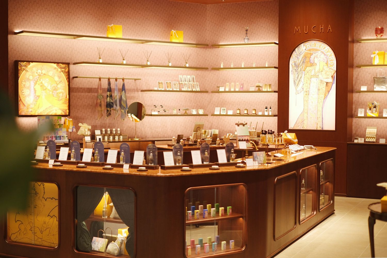 店内に足を踏み入れると、まるで小さな美術館を訪れたような特別な空気感。アーチを描く空間、光を差すように飾られた「ジスモンダ」の絵画、ミュシャ作品をモチーフにしたフレグランスの数々ーー19世紀末の優雅さと現代的な洗練が調和し、芳しい香りも相まって、日常から離れた胸高鳴る時間をもたらしてくれます。