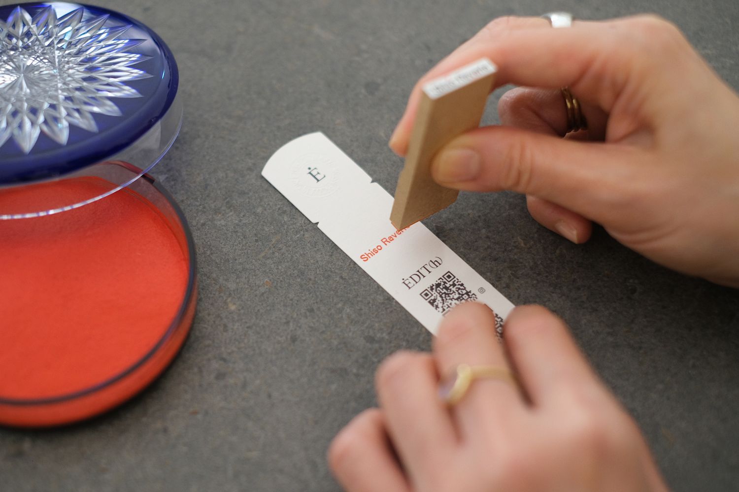 テスターで使用するムエット(試香紙)には、香りの名前がわかるよう朱肉印を押してくれるなど、ちょっとしたところにも〈ÈDIT(h)〉らしさが散りばめられています。