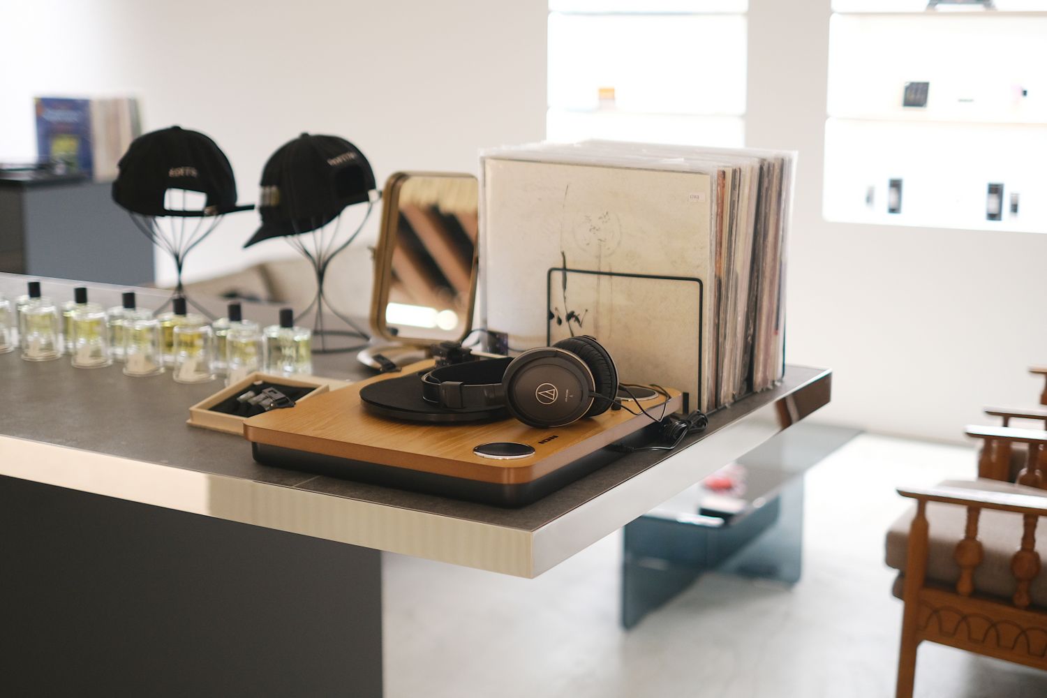 店内では、独自の世界観を体感できる五感くすぐるアプローチが展開され、まさにリアル店舗ならではの醍醐味。ワンビル2階にある『Face Records』とのコラボレーションで、ブランドの世界観に共鳴する楽曲をFace Recordsがキュレーション。ジャズ、ポップス、邦楽、洋楽と、ジャンルレスな選曲がおもしろく、気に入った音盤はその場で購入できるよう準備を進めているそう。