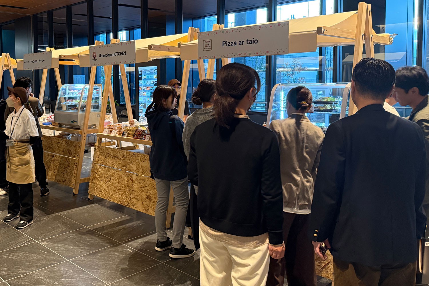 またスカイロビーの一画に設置された「ONE MARCHE」には、館内の食物販店舗を代表して7店舗が日替わりでスカイロビーにサテライト出店。スイーツやサラダ、デリなど映画のおともにぴったりな商品はもちろん、一部の店舗では12/24・12/25に受け取れるクリスマス用の商品の事前予約も実施。オフィスフロアで働く人々が立ち寄る姿も見られました。