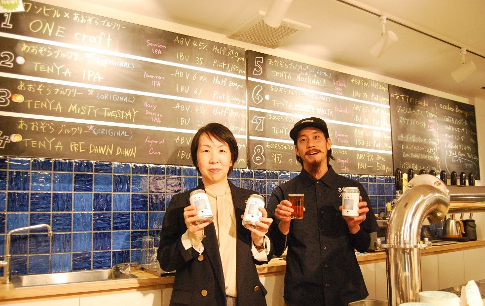 1月17日、「あおぞらブルワリー」(博多区)では、この日発売されたばかりのビールを囲むお客様の姿が見られた。そのビールは「ONE craft」(ワン・クラフト)。ワンビルの開業を記念して造られた“天神のビール”だ。ビルのコンセプトである“創造交差点”を表現している。心待ちにしていた人々は店内でさっそく喉を潤し、「飲みやすい!」と笑顔で話した。