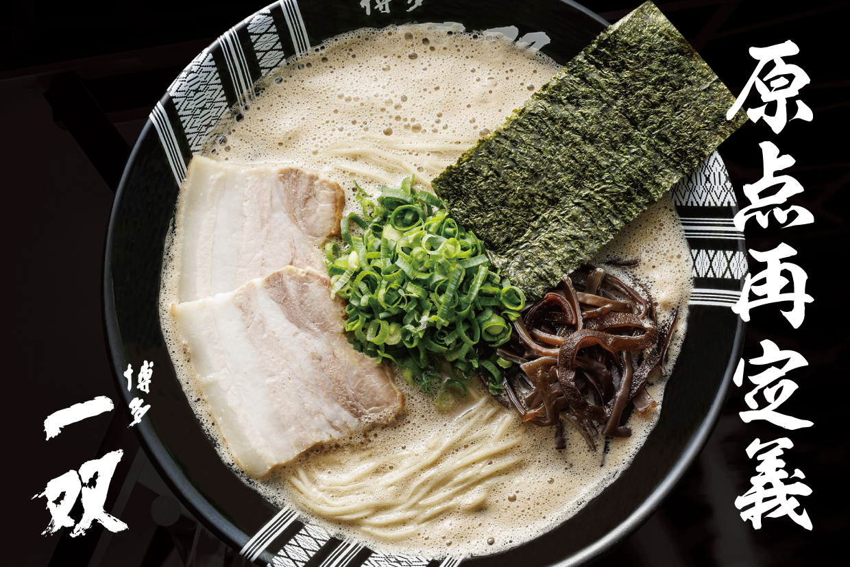 博多一双は福岡発の泡系とんこつの名店。濃厚でクリーミーなスープは「豚骨カプチーノ」と呼ばれ、博多で長蛇の行列ができる人気店。 自家製タレと香味油が旨味を重ね、替玉で最後まで楽しめます。