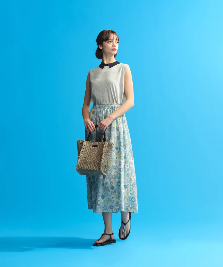 リバティプリントを前身ごろに配したコンビニットプルオーバー。