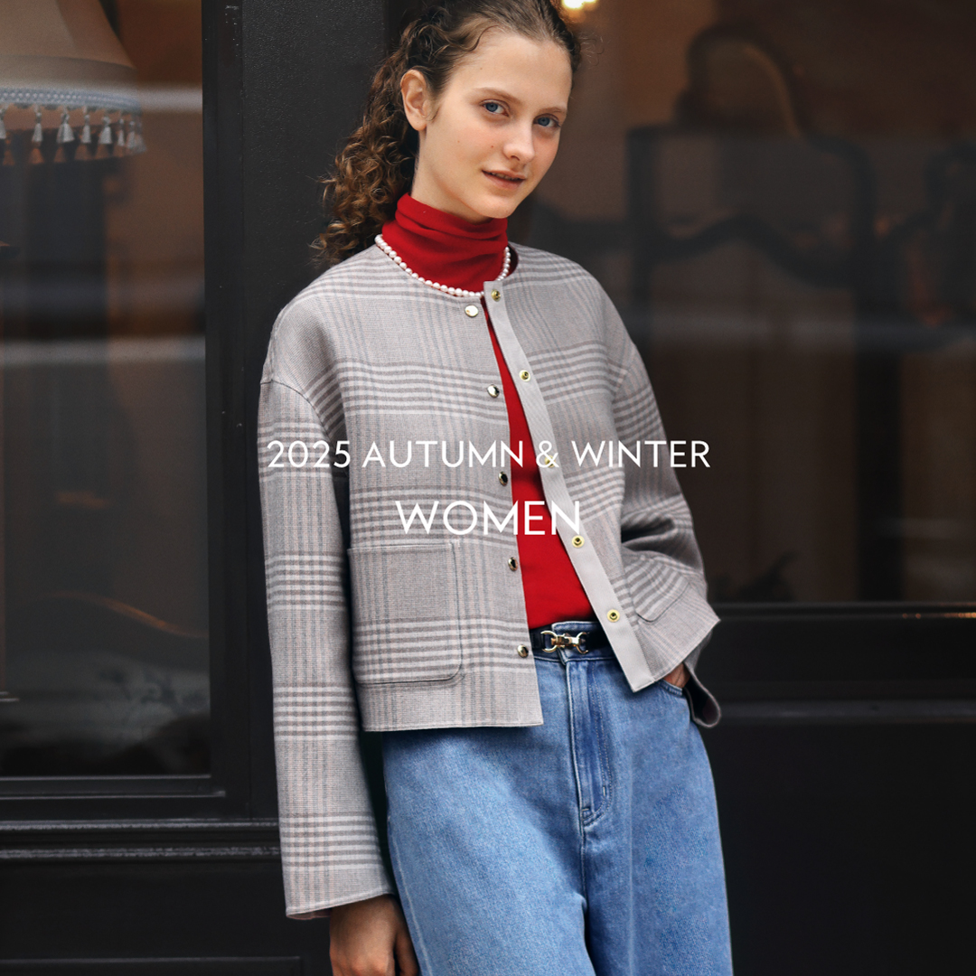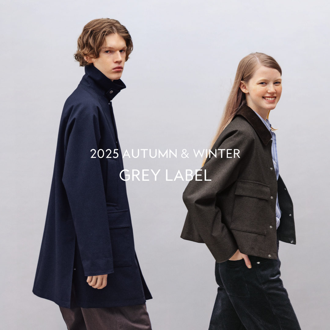マッキントッシュ フィロソフィーのグレーラベルは、男女でシェアできるユニセックスのアウターウェアや、同じ柄を使った男女それぞれのアイテムなど、ユニセックスなムードの軽やかなコレクションです。