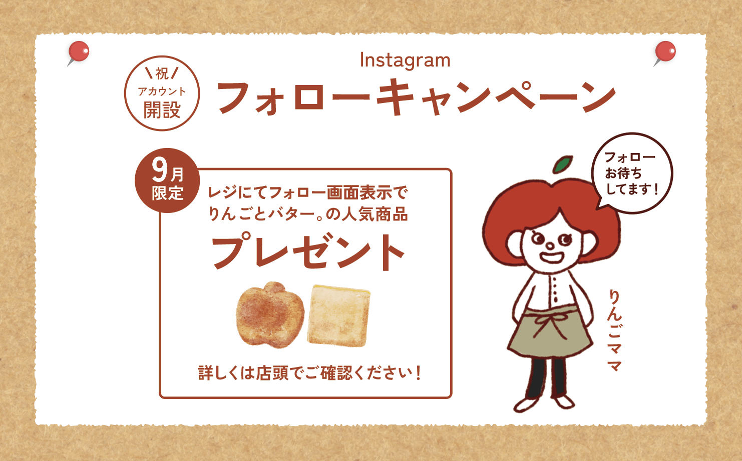 レジにて「りんごとバター。Lab」公式Instagramのフォロー画面をご提示いただくと、「フィナンシェ」または「クッキー」いずれか1つをプレゼント! 🎁