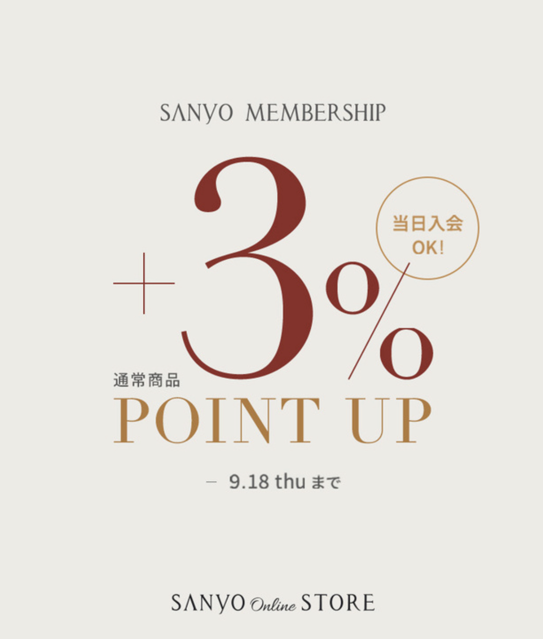 上記期間中、SANYO MEMBERSHIP対象店舗では 通常商品をお買い上げの際に「通常+3%ポイント」をプレゼントいたします。