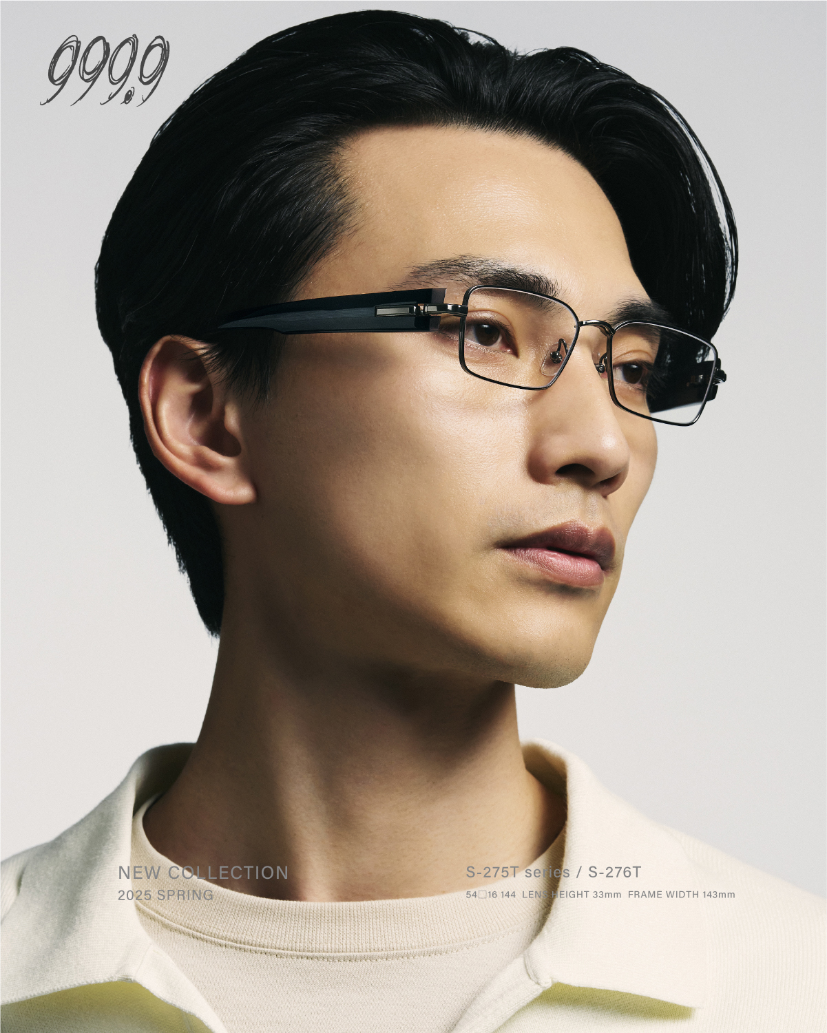 精悍な印象のメタルフロントと、圧倒的な存在感を持つ幅広のプラスチックテンプル、そのギャップが細やかな作り込みによって融合し、掛け姿に鮮烈な印象を与えるコンビネーションフレームです。