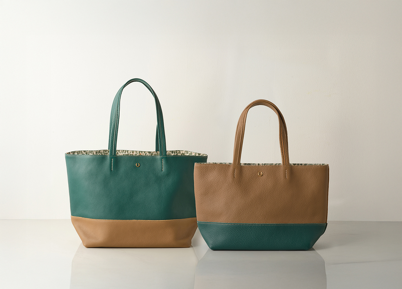 グリーンとモカベージュのバイカラーに”幸運のモチーフ”蹄鉄がさりげないアクセントのトートバッグです。