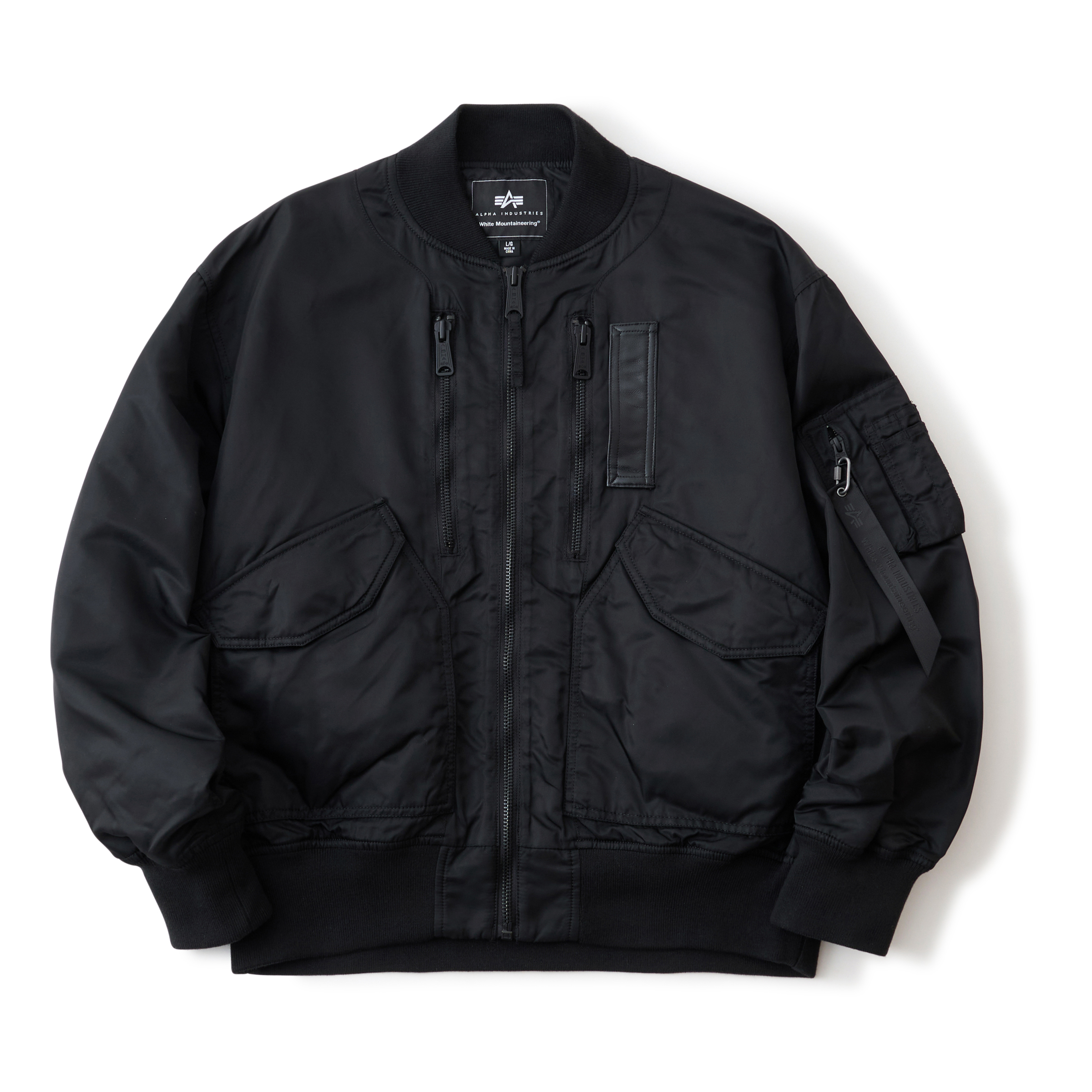 25AWコレクションより、ALPHA INDUSTRIESとの初コラボレーションモデルが登場。CWU-45/Pフライトジャケットをベースに、MA-1のディテールを取り入れ、White Mountaineeringらしいパターンメーキングでシルエットを再構築、さらに軽量化のためにあえて中綿を取り除き、秋から冬にかけて長いシーズン着用できる仕様に仕上げています。裏地やレッドタグも全てオールブラックに統一し、モダンな印象でアレンジ。