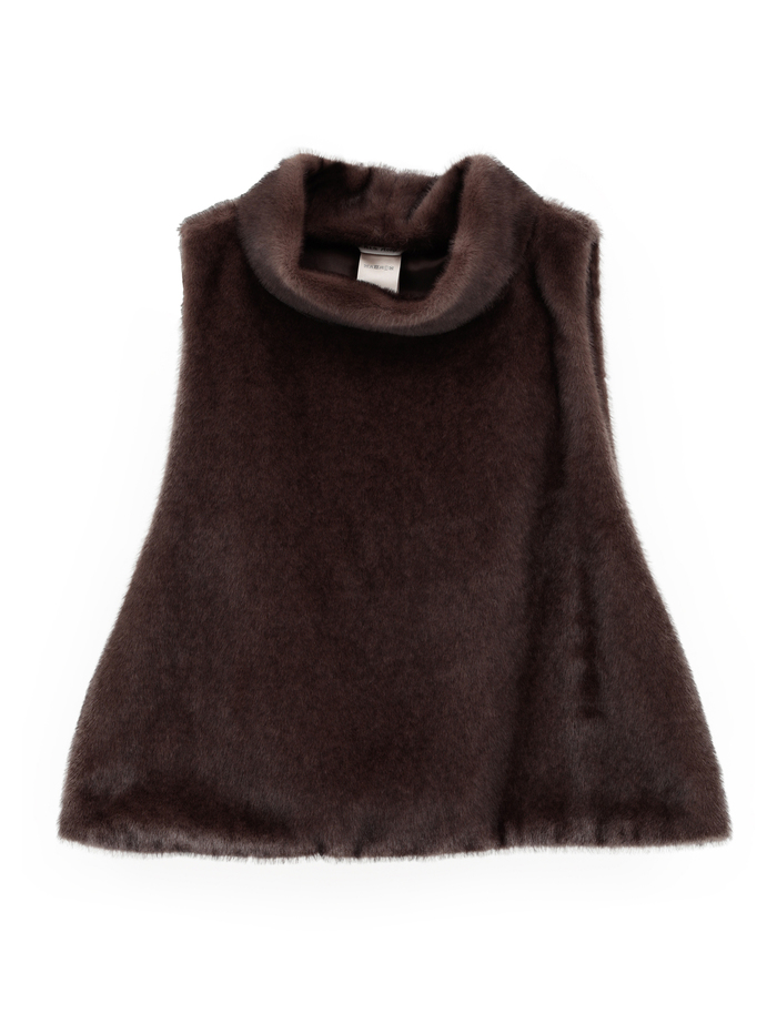 オフタートルネックのエコファーベスト。 サイズはフリーサイズで着る人を選ばないデザインで、サイドを開けられるように付けられたボタンで着脱が簡単です。 カラー展開は、オフホワイト、グレー、ブラウンの三色です。