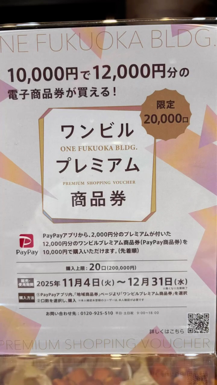 ONE FUKUOKA BLDG. で使えるお得な プレミアム商品券が2025年11月4日(火)から購入できます🤩 10,000円で【12,000円分】の電子商品券が買えちゃいます🫢