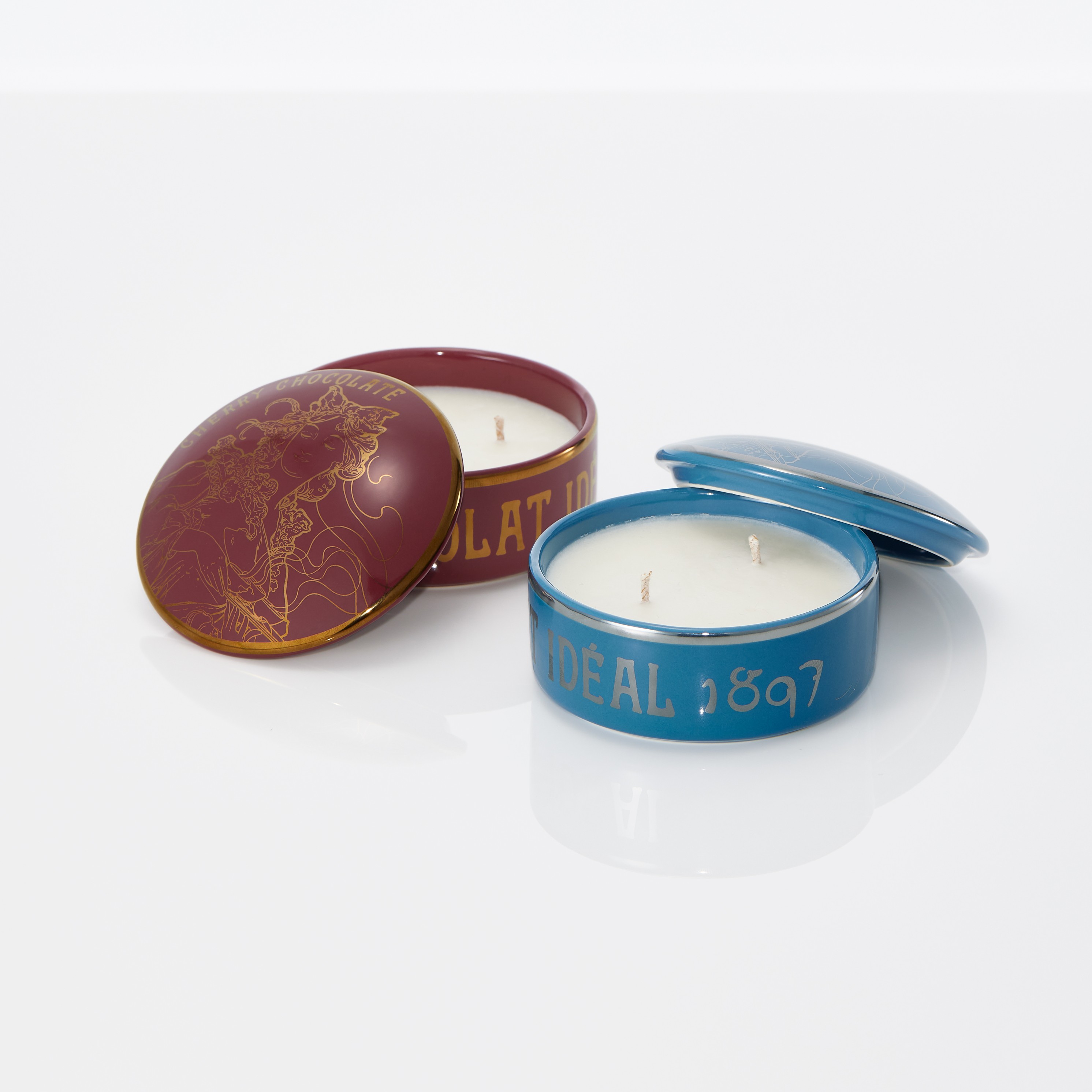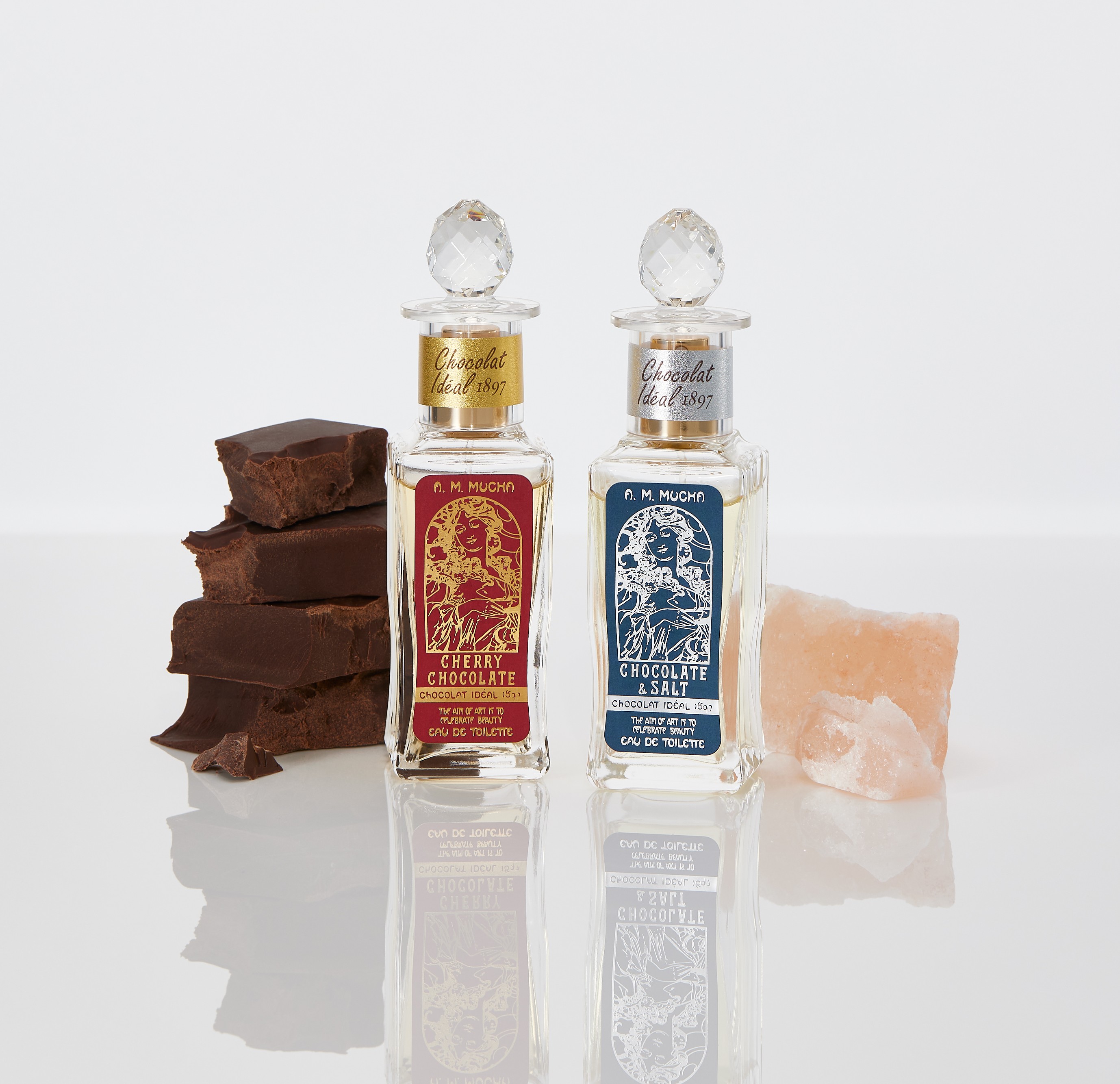 19世紀末のパリの生活を色彩豊かに描いたミュシャのインスタント・ココアのポスター『ショコラ・イデアル』からふたつのフレグランスが登場