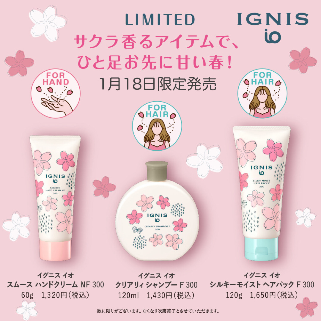 イグニスの人気アイテムが 心躍るサクラパッケージになって今年も登場。 春に向けたうるおい計画を。 今年は毎年人気のハンドクリームと シャンプー、ヘアパックです。 今だけのイグニスのサクラの香りアイテムをぜひゲットしてください。