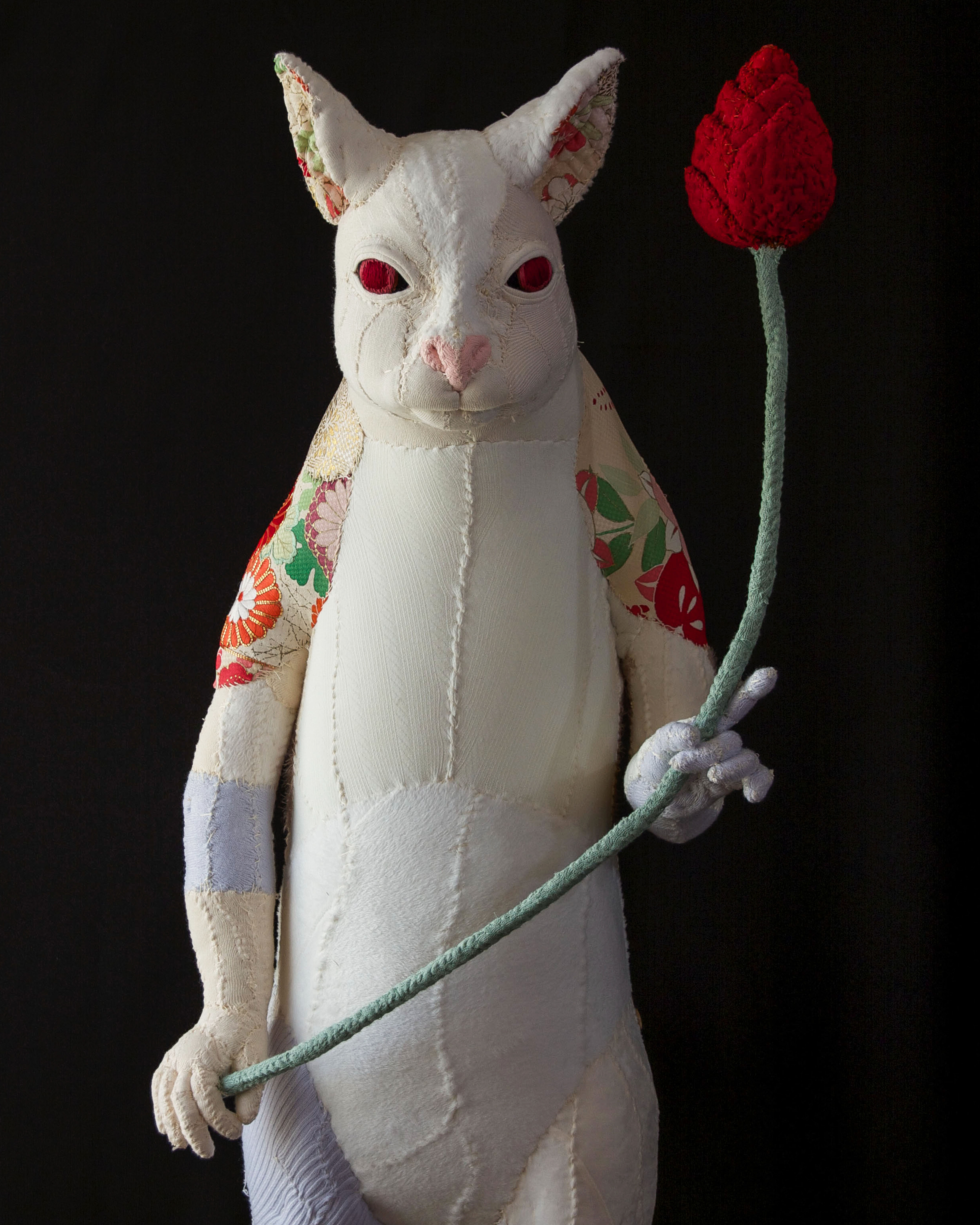 素材として用いる使われなくなった衣類は、持ち主と共にあらゆる出来事や思い出を貯蓄する存在であり、同時に死者のようでもあると考えています。姿かたちは動物でありながら、どこか人間らしさを感じる所作は、私たちに生と死を教えてくれる伝達者なのかもしれません。(SICF18 EXHIBITION部門 栗栖良依賞)