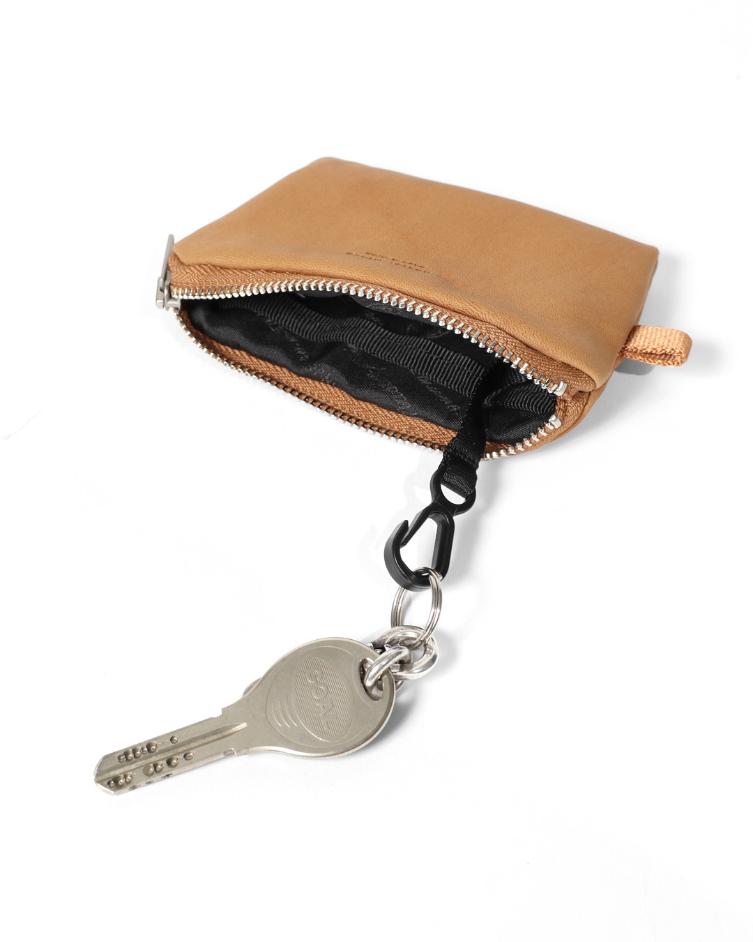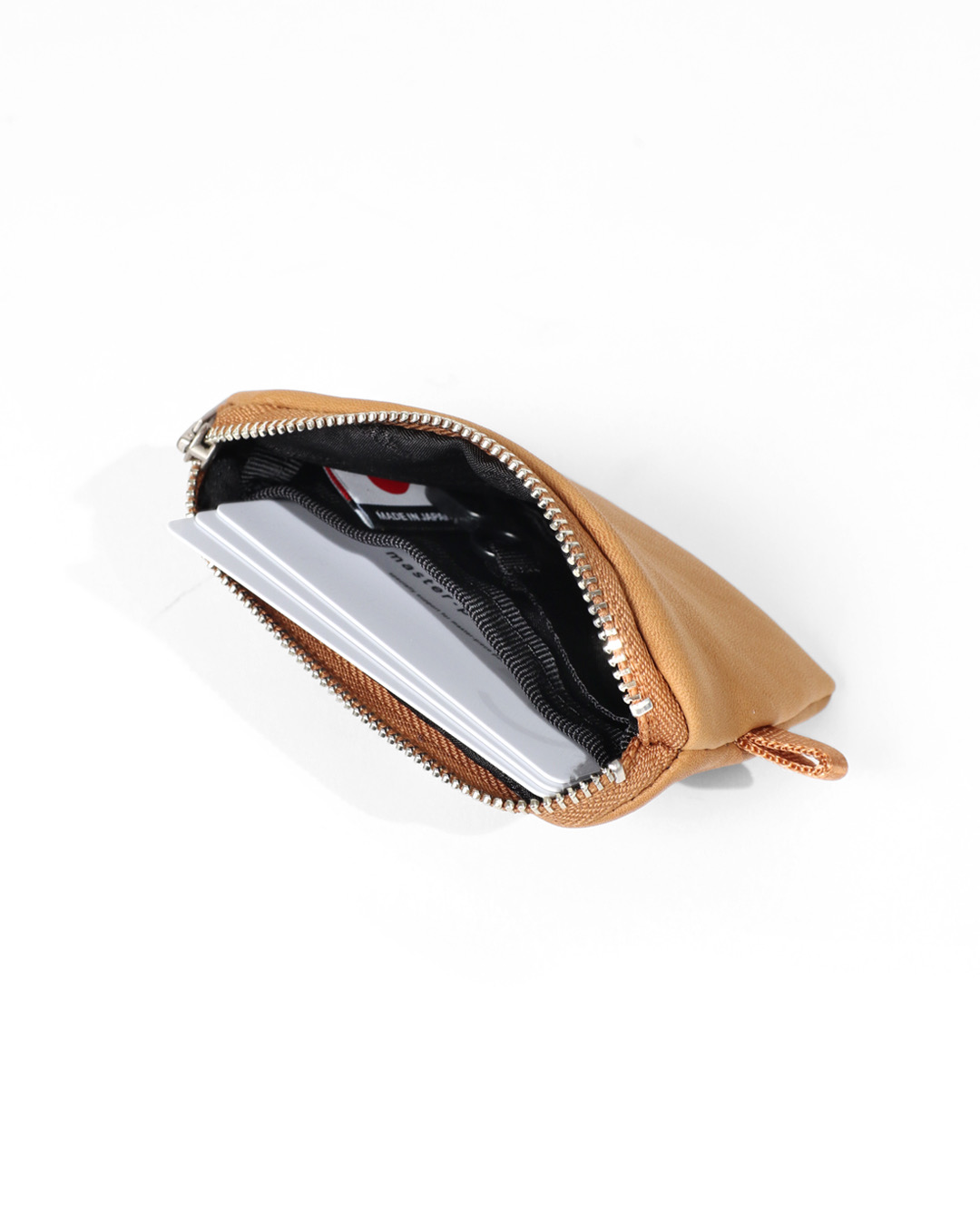 防水ガーメントレザーを使用した、片手に収まるサイズ感が使いやすい収納ポーチです。