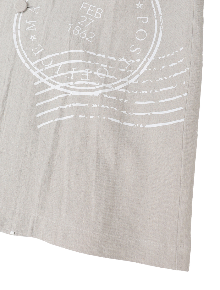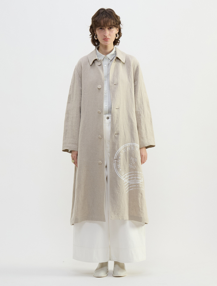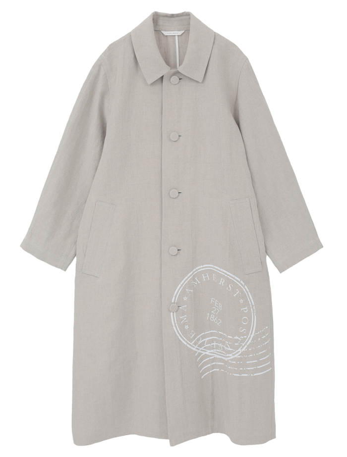 リネンの織物産地である浜松で織り上げたナチュラルなワッシャー感が特徴のリネン100%素材。 ゆったりとしたシルエットが魅力のベーシックなステンカラーコート。前身ごろには手紙の消印プリントを配し、迫力のある一枚。 是非、ご来店お待ちしております。