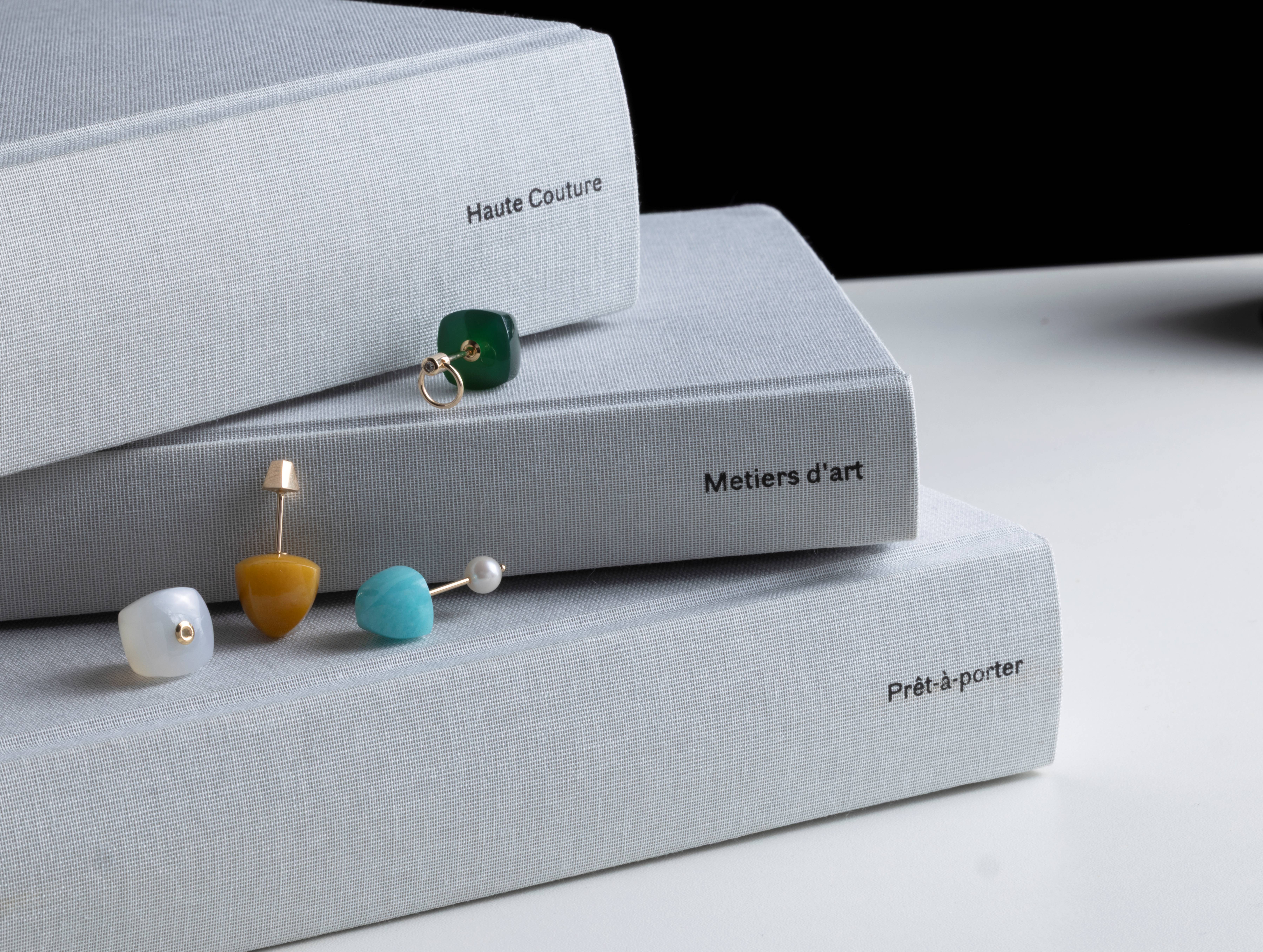 シュガーローフカットのカラーストーンがスタイリングのアクセントに。シュガーローフカットは、かつてヨーロッパで使われていた円錐形のお砂糖の塊「シュガーローフ」に由来します。
