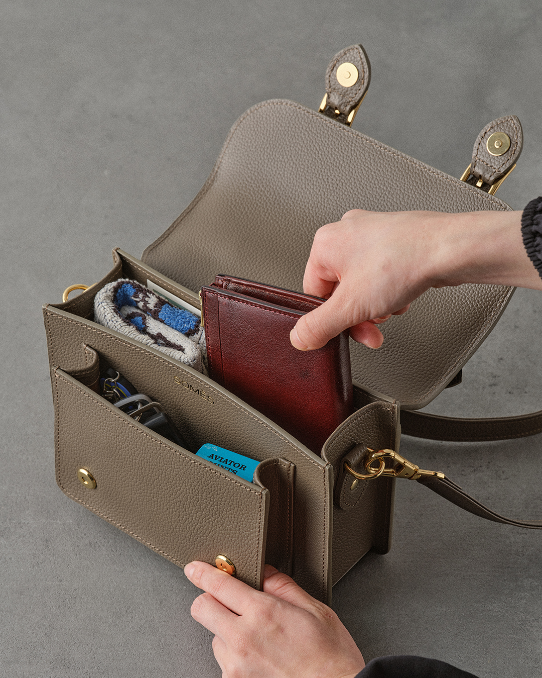 SATCHEL BAG に求められる端正で構築的なフォルムと牛に触れた瞬間に感じるしなやかさ、相反する要素を高い次元で両立させました。
