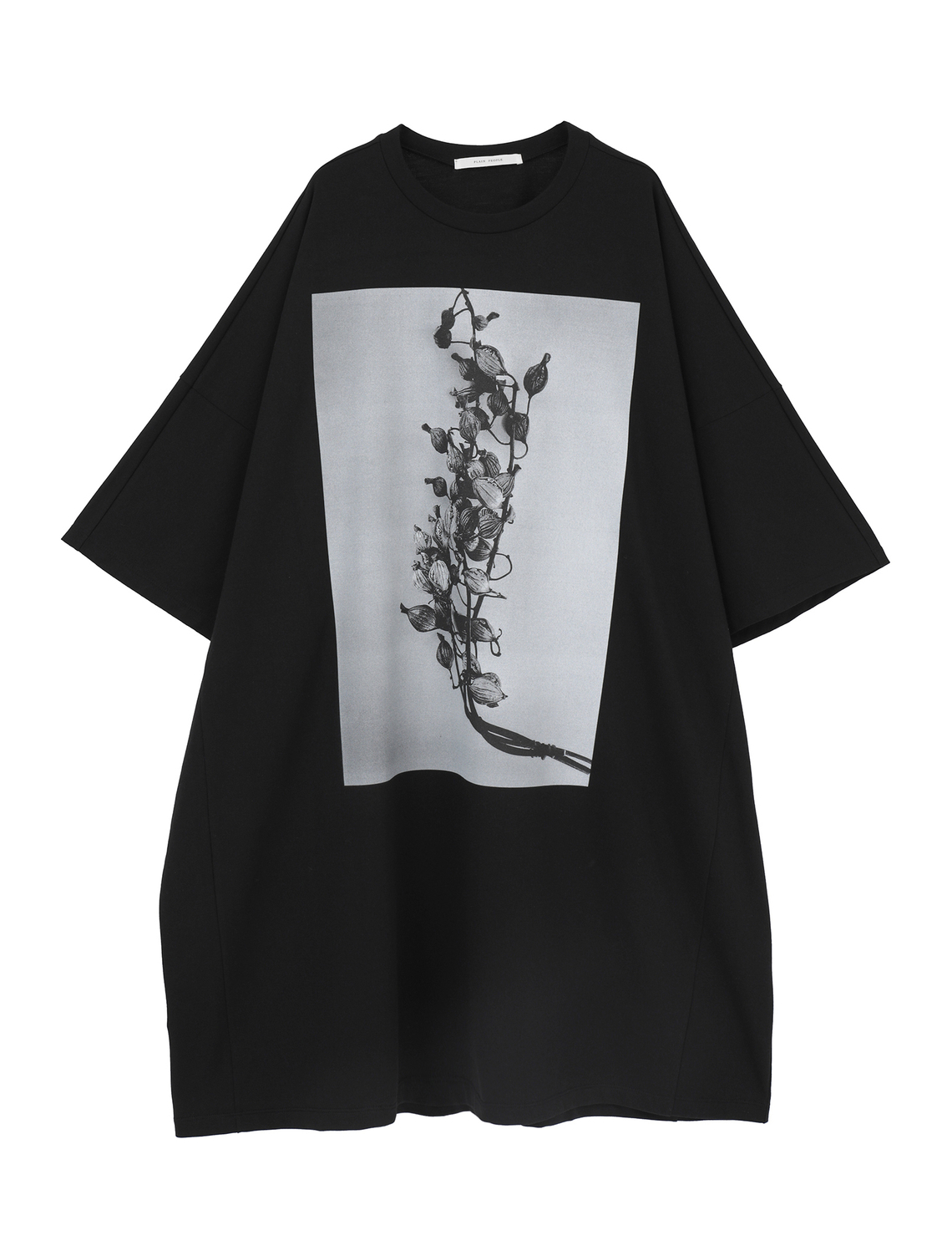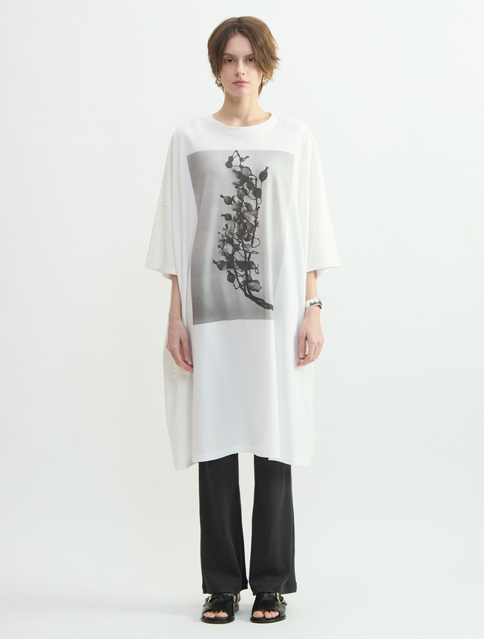 ハリ感としっかりとした肉厚感が特徴のインレー素材です。64/2のサイロコンパクトの強撚糸を使用し、毛羽立ちが非常に少なく、クリアな表面と高い光沢、高い強度・耐摩耗性を持ちます。滑らかな裏毛スウェットのように、伸びにくく型崩れしにくい「織物のような」風合いが特徴です。ビックサイズのTシャツ型チュニックに、「月桃/ゲットウ*」の写真プリントを大きく施したアートなアイテムです。