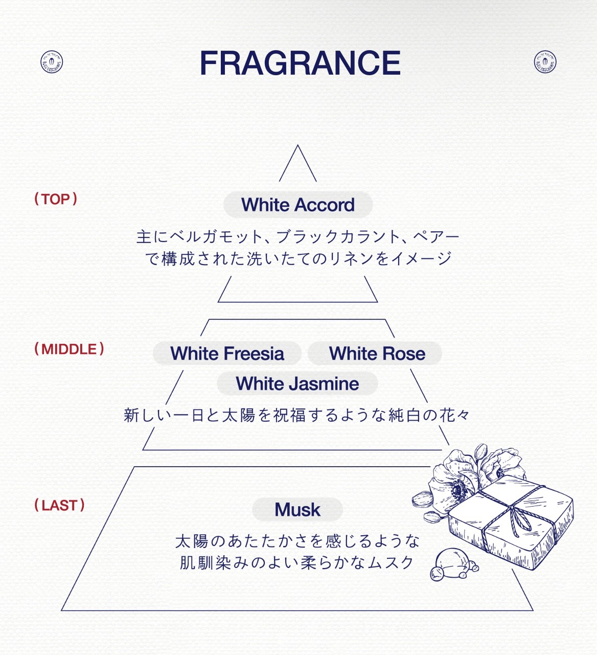 ラストはムスクが柔らかにたゆたい、陽射しの温もりが残るリネンのように素肌と心をそっとくるみます。